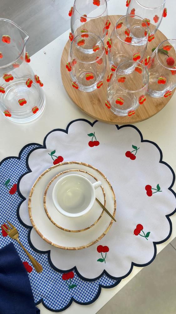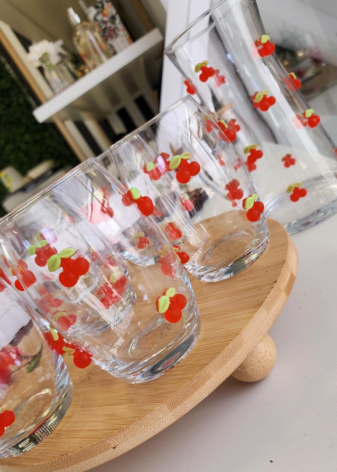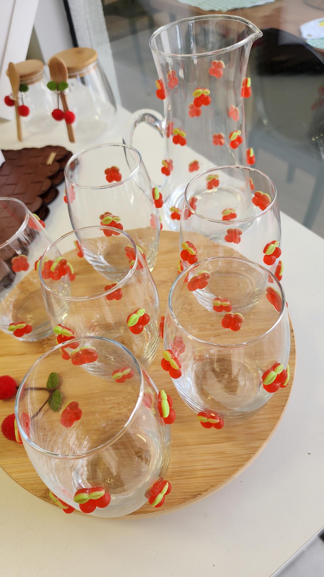 Jogo de 6 copos e jarra de vidro, feitas artesanalmente para compor a Coleção Cereja, para trazer alegria com exclusividade para a sua mesa!!