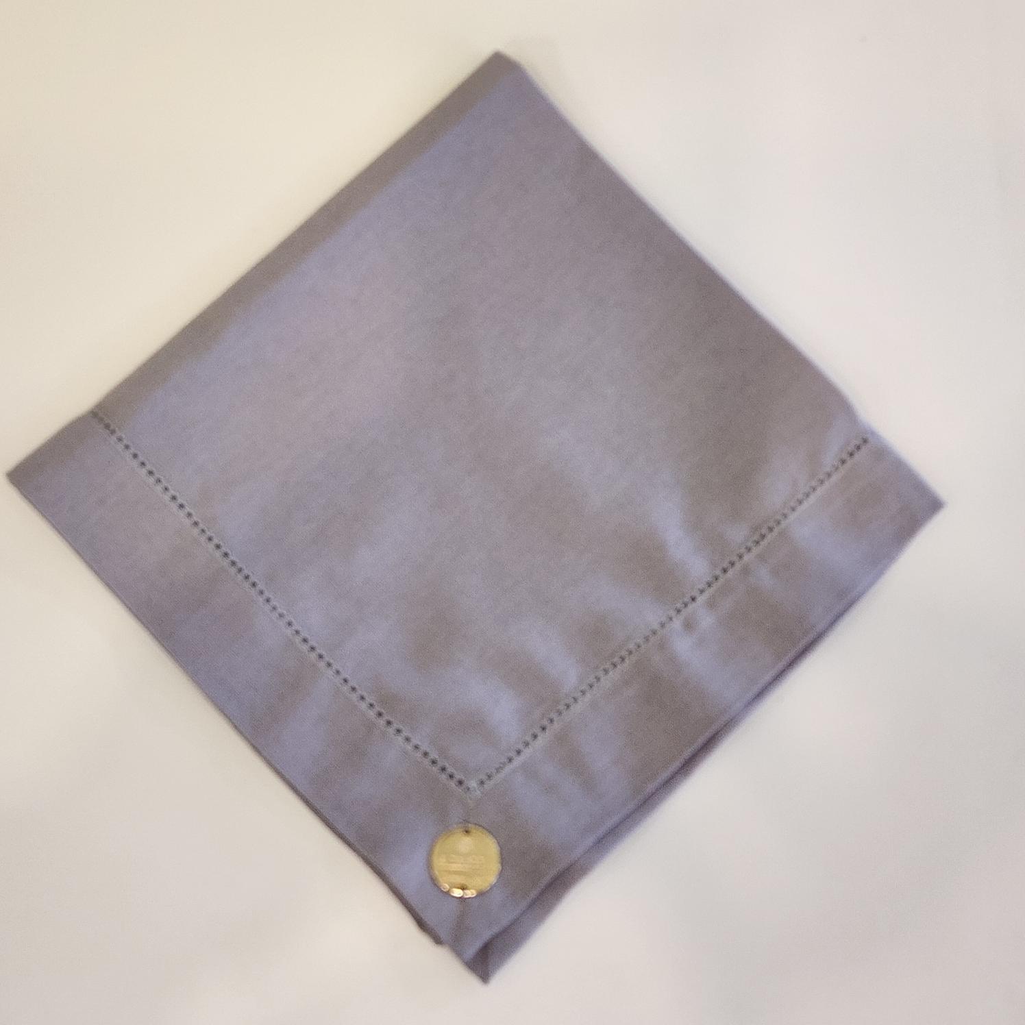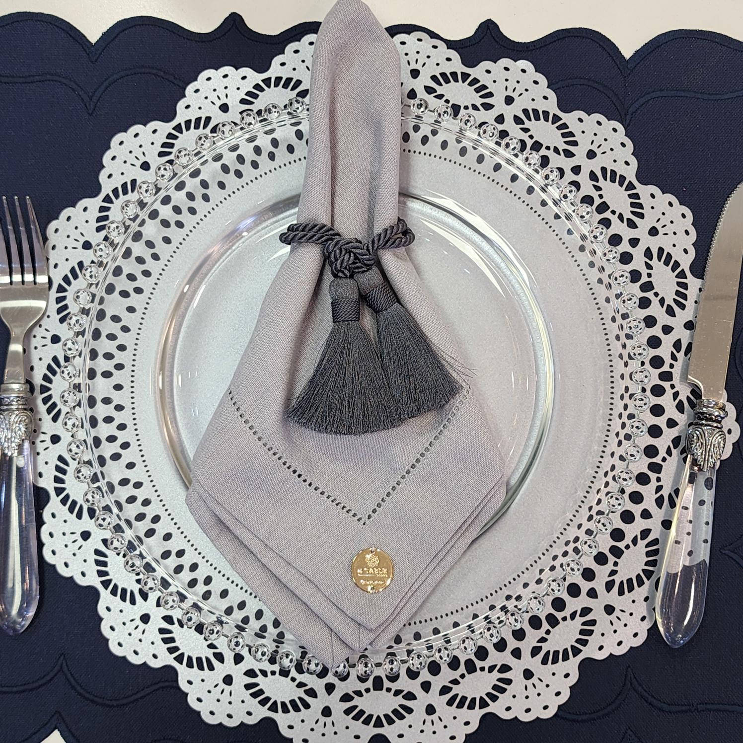Guardanapo em linho misto CINZA, COM ACABAMENTO EM PONTO AJOUR, da Coleção Primavera.
