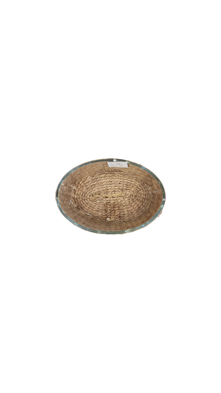 TRAVESSA DE VIDRO BOROSSILICATO OVAL GRANDE COM SUPORTE EM RATTAN